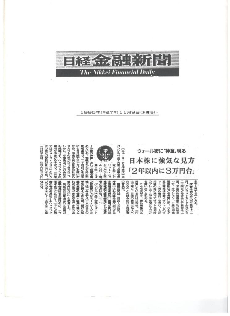 “ウォール街に’神童’、現る:日本株に強気な見方「2年以内に3万円台」” [A “Prodigy” Appears on Wall Street: Bullish on Japanese Stocks, “30,000 Level Within 2 Years”]. Nikkei Kinyu Shimbun [The Nikkei Financial Daily], November 9, 1995.